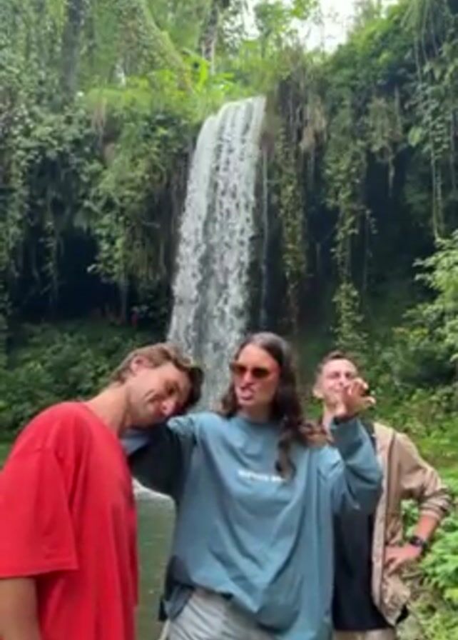 four people posing for a picture in front of a waterfall in a jungle setting. The waterfall is the backdrop, surrounded by lush green vegetation. In the foreground, on the left, a man in a red t-shirt is leaning his head towards the center. A woman wearing a light blue sweatshirt and sunglasses is in the middle making a funny face and clawing hands. A man in a black shirt and a tan jacket stands to the right of the woman, striking a pose with his hand on his hip. Another woman in a black shirt and braided hair comes into the shot on the right and begins to pose. They appear to be enjoying the scenic location and capturing a fun moment together.