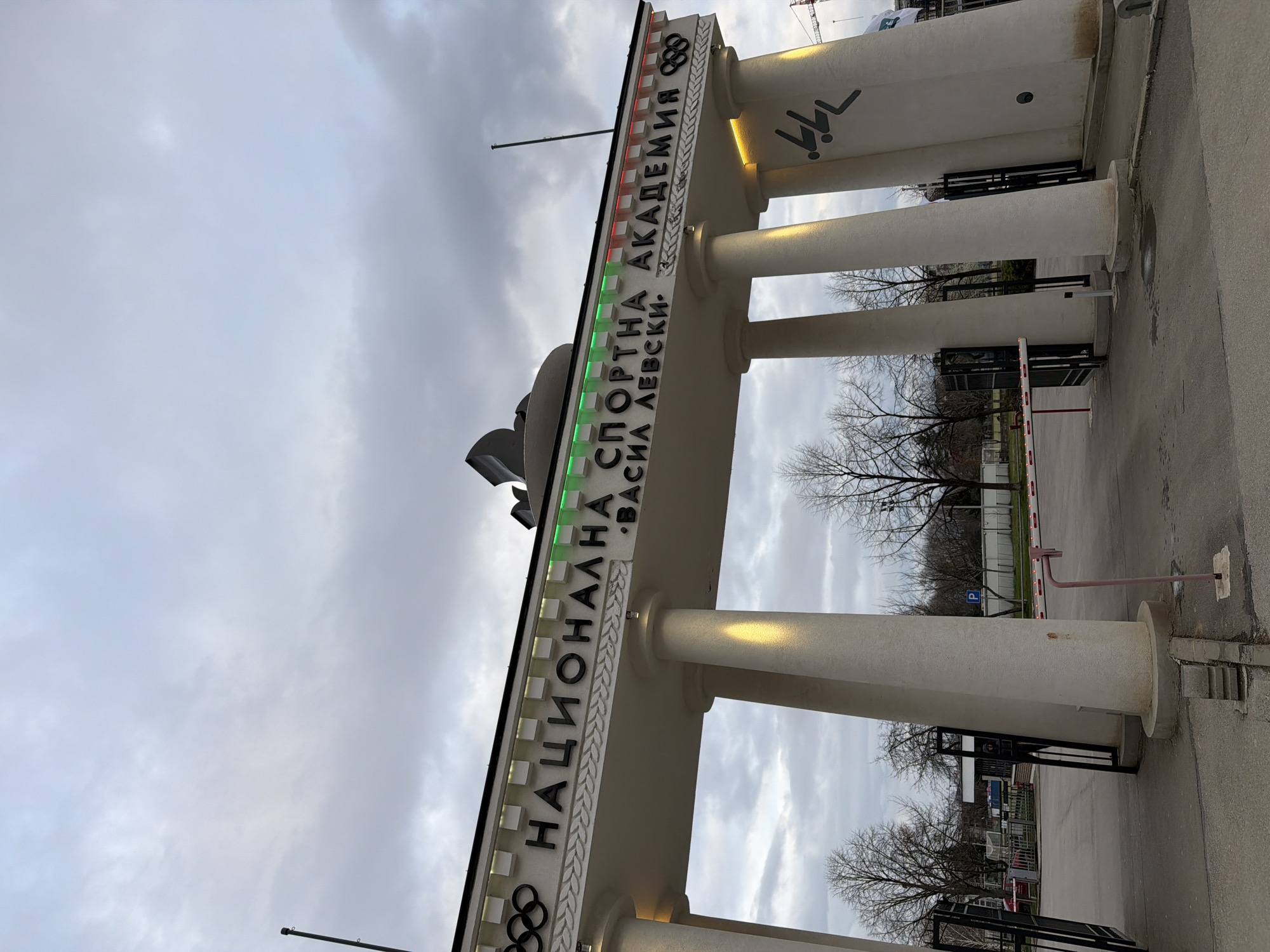 entrance to the Vasil Levski National Sports Academy in Sofia, Bulgaria. The entrance is marked by a large, white archway adorned with the Olympic rings and the name of the academy in Cyrillic script. The colors of the Bulgarian flag (white, green, and red) are visible along the top of the archway. The archway is supported by several white columns. A black pedestrian gate is visible on the right side of the archway, along with a red and white barrier arm. Trees with bare branches are visible in the background, along with a glimpse of a parking lot and buildings. The sky is overcast with grey clouds. The viewpoint is from a low angle.