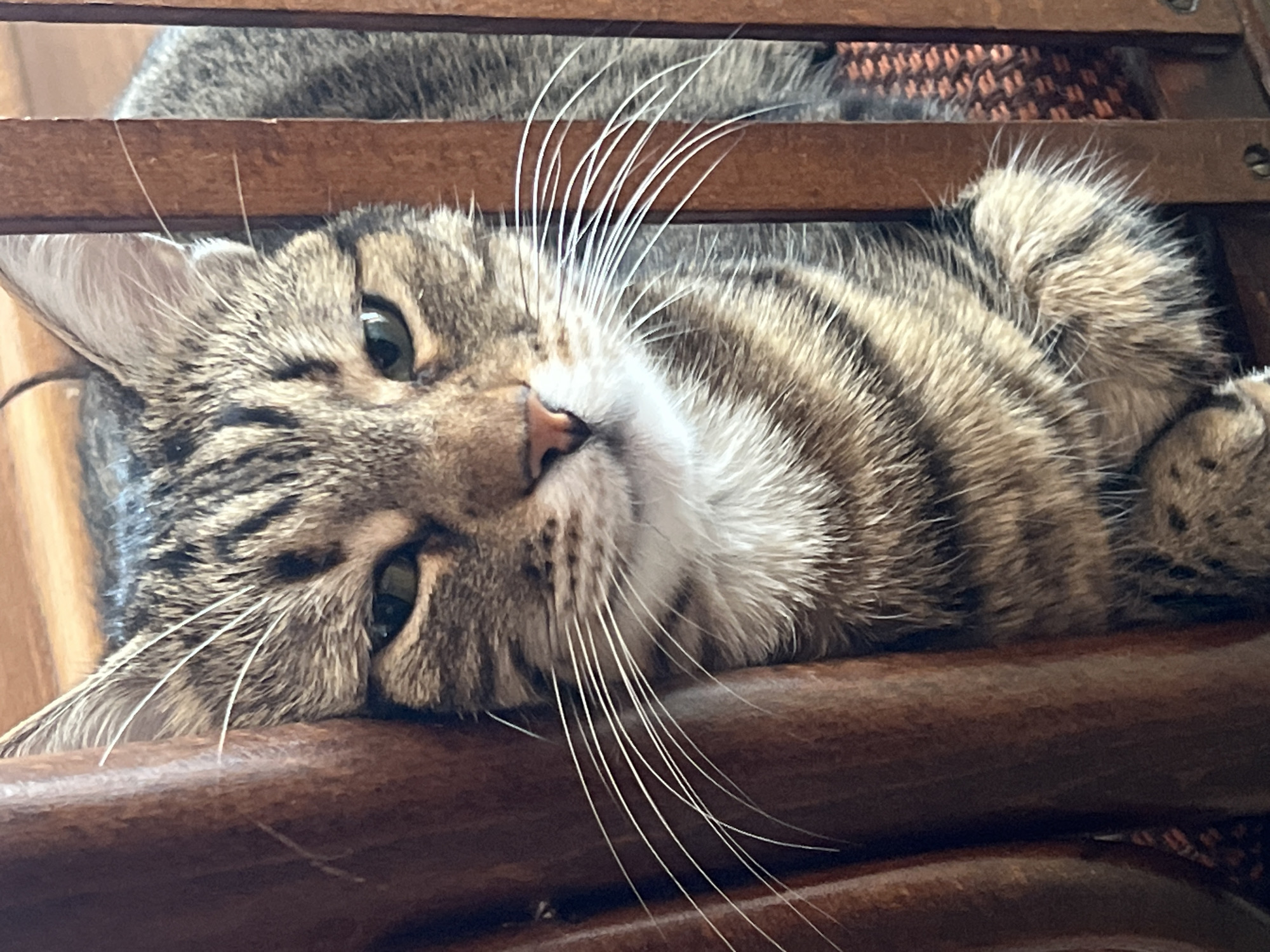 In Karnobat, Bulgaria, an adult domestic tabby cat is depicted in a close-up portrait. The cat exhibits brown and grey striped fur with darker bands, a white chest, and a pink nose. Its greenish-yellow eyes are slightly narrowed, and prominent white whiskers extend from both sides of its muzzle. The cat is positioned between the dark brown wooden vertical slats of a chair, with its head centered and its front paws resting on a woven, orange-brown patterned seat cushion visible through the slats on the right. A curved wooden element of the chair's backrest is visible on the left. The scene is illuminated by an ambient indoor light source, with the background consisting of a blurred, lighter brown surface. The cat looks directly towards the viewer.