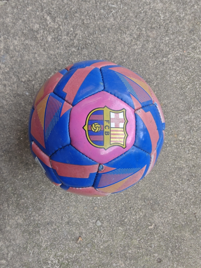 - "A used football, predominantly blue and pink with red and orange striped accents, rests on a light grey, coarse concrete surface in Wigan, United Kingdom" by FM-21ApN2, licensed under CC BY 4.0