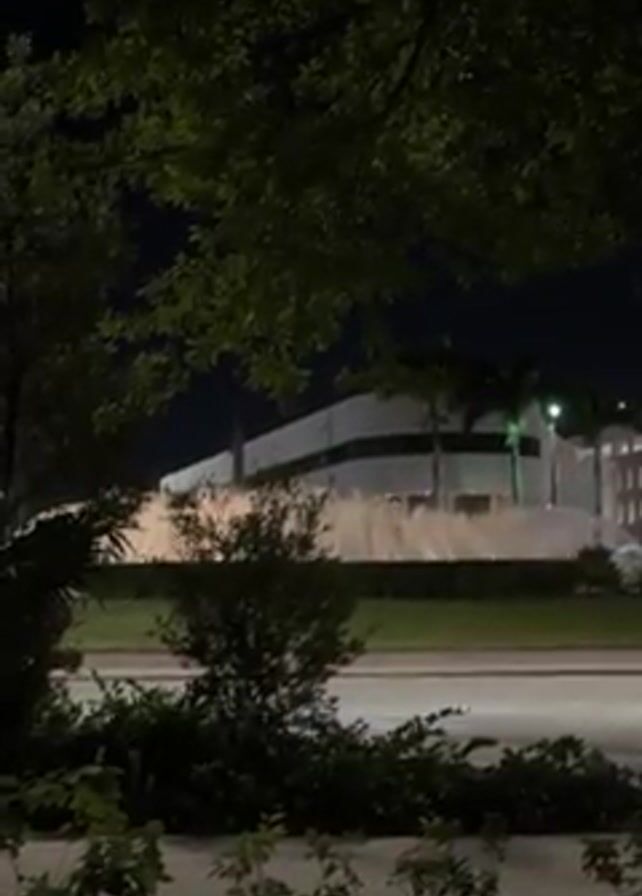 The scene is set at night, with a building featuring a cascading fountain illuminated in the background