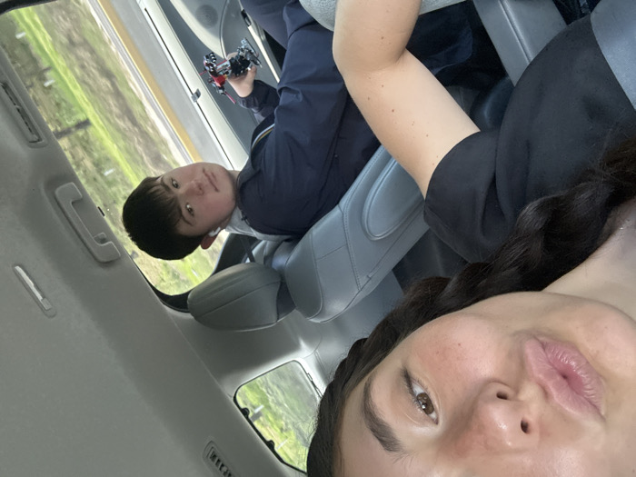This image captures two individuals inside a vehicle, ostensibly located within or traveling near El Pipirín, Mexico. In the immediate foreground, an adult female with dark hair and brown eyes is visible from the chest up, wearing a dark-colored top. She is positioned as if taking a selfie, with her lips pursed. In the background, seated in a light grey passenger seat, is a juvenile male with short dark hair, wearing a dark blue jacket and white in-ear headphones. He holds a small, intricate black and red toy vehicle, resembling a model car or remote-controlled car, in his left hand and looks directly towards the camera. The vehicle's interior features light grey upholstery and ceiling. Through the windows, a blurred outdoor environment with green vegetation and a paved road surface is visible, indicating motion during daylight hours.