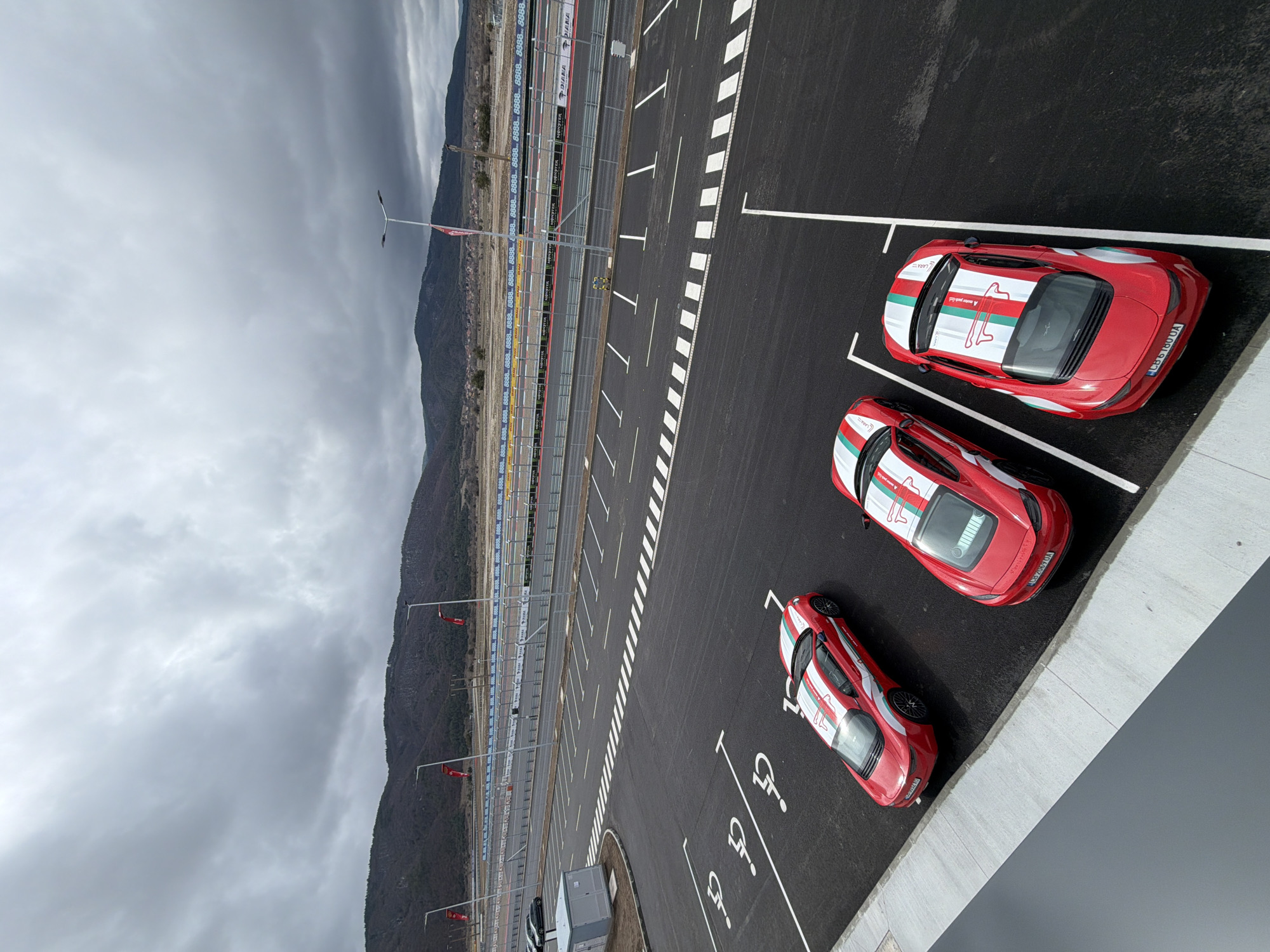 n aerial view of a parking lot in Dospey, Bulgaria. Three red cars are parked in handicapped spots. The parking lot is adjacent to a racetrack with barriers and flags. Mountains and a cloudy sky are in the background.