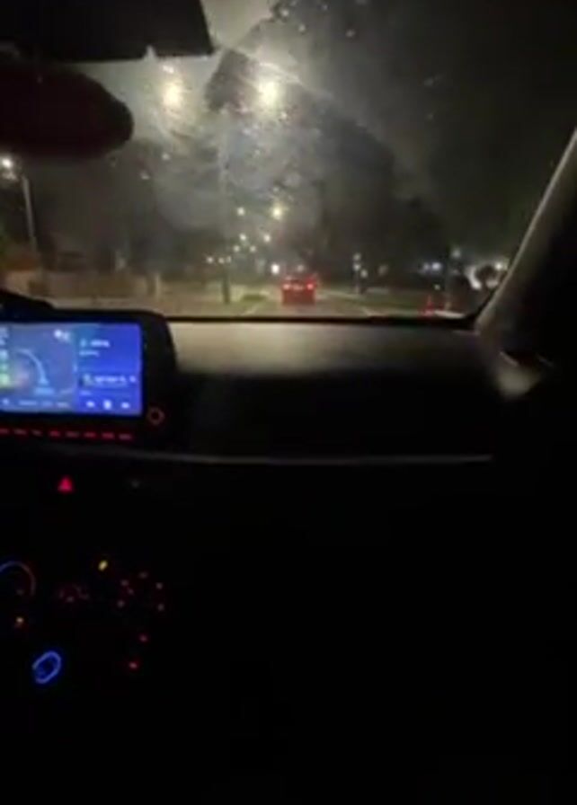 view from inside a car driving at night. It appears to be raining, and there are streetlights illuminating the road. Another car is driving ahead of the car recording the video, and its tail lights are visible. The dashboard of the car in which the video is being recorded can be seen. The car's navigation system is displaying a map. Music is playing in the background.