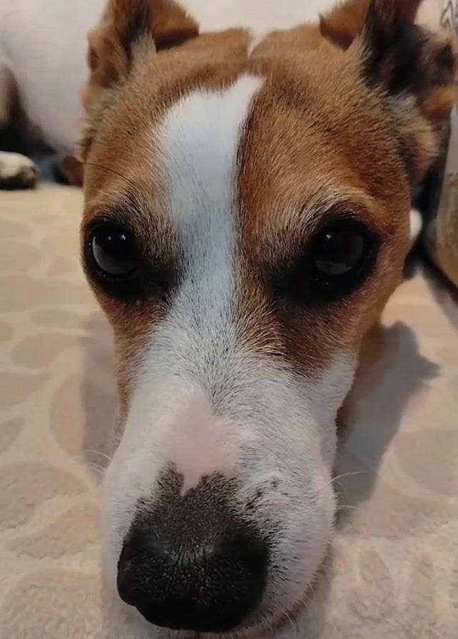 A Jack Russell Terrier is lying down on a beige surface. The dog has a white face with brown patches on the ears and head. The dog's nose is black. Part of the dog's body is visible in the background. The lighting is even. The camera is focused on the dog's face.