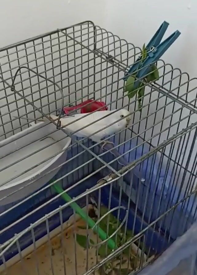 white budgie sitting on a perch in a wire cage. The cage is placed against a white wall. There is a food container and a water container in the cage, along with some leaves held by a clothespin attached to the top of the cage. The cage is lined with a blue plastic sheet at the bottom. The budgie is looking towards the camera.