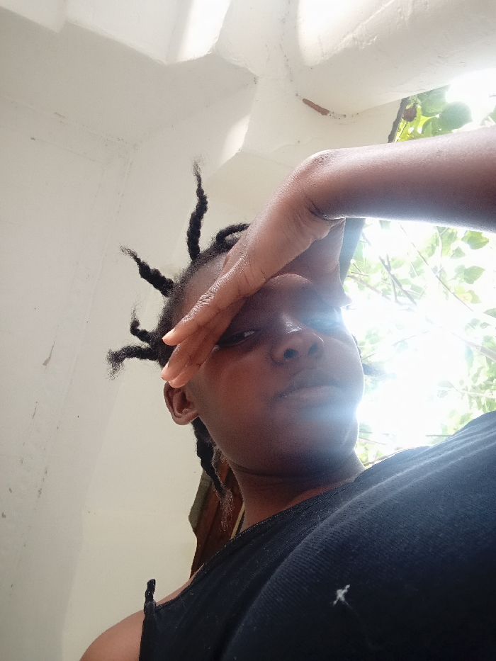 A low-angle shot depicts a person with dark skin and dreadlocks, shielding their eyes from bright sunlight with their right hand. They are wearing a black top and stand near a white wall, partially obscured by the sun's glare. Some leaves are visible above. The overall composition appears casual, possibly a selfie taken outdoors.