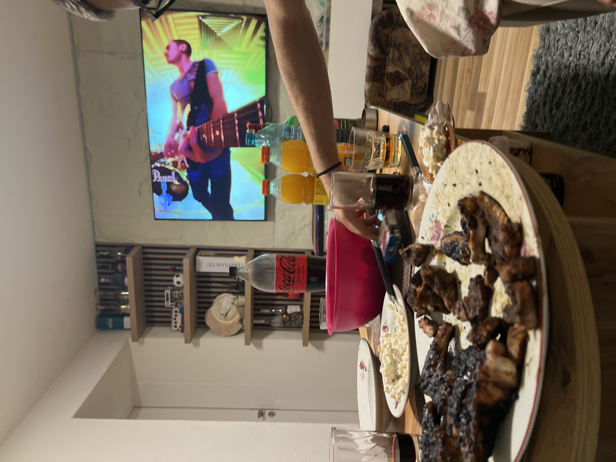 The image captures an indoor scene within a residence in Staro Zhelezare, Bulgaria, depicting a casual gathering around a table. In the immediate foreground, a wooden table holds a large white plate with a substantial quantity of grilled meat, exhibiting dark charring on some pieces. Adjacent to this, smaller white plates contain a creamy, mixed salad. Beverages on the table include a large 2-liter Coca-Cola bottle (labeled "Без захар"), two plastic bottles of orange juice, and a clear plastic bottle of water with a green label. Glasses filled with dark liquid (cola) and an amber liquid (possibly spirits) are present, along with an empty glass. A prominent red mixing bowl, a blue and white cigarette pack, and a lighter are also visible. A person's forearm, adorned with a black wristband, extends from the right side of the frame, reaching towards the table. In the background, a large flat-screen television is mounted on a wall, displaying a vibrant, colorful image of an individual playing a guitar or bass, with drums in the background, indicative of a music video. To the left of the television, a wall unit composed of light wooden shelves against vertical wooden slats showcases various decorative objects, including multiple bottles, a round clock, a miniature red and white bus, a small soccer ball, a hat, and books. The room features a light-colored wooden floor, partially covered by a gray shag rug. A white door frame is visible on the far left. Part of a patterned fabric, possibly from a chair or blanket, is visible on the far right.