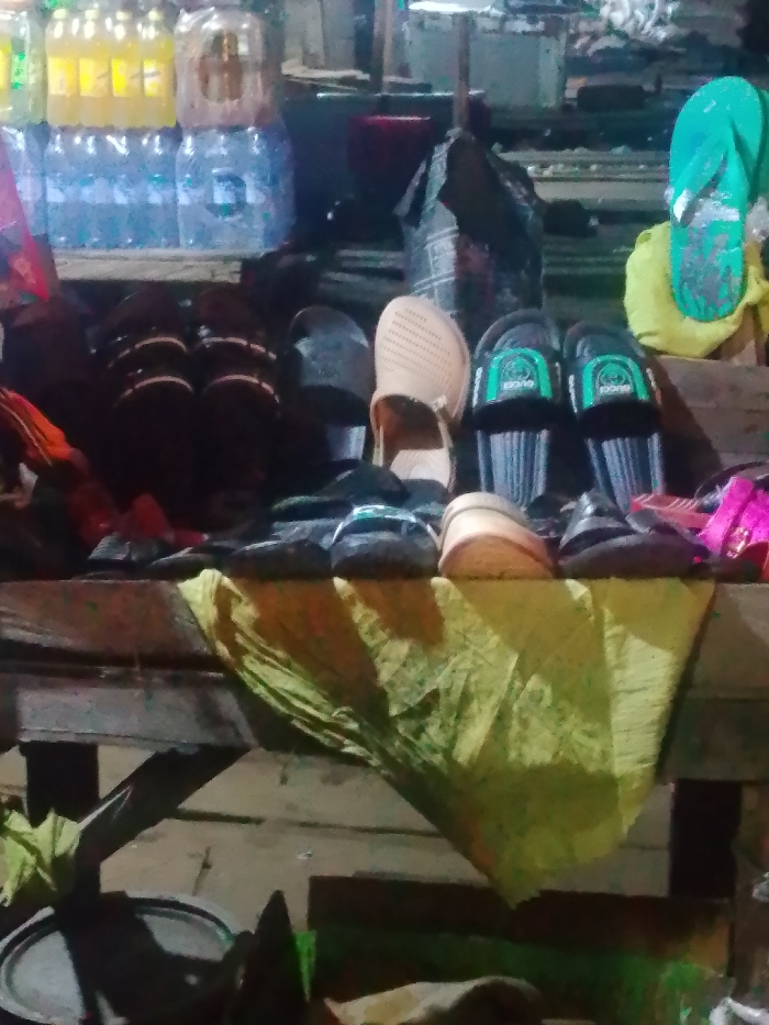 The image displays a market stall at night in Lokoja, Nigeria. A wooden surface, partially covered by a light green patterned fabric, serves as a display area for various footwear. Prominently featured are multiple pairs of sandals and slippers, including black closed-toe styles, a light beige perforated open-toe sandal, two pairs of black and green slides with "GUCCI" branding, and a singular bright green flip-flop resting on a yellow cloth to the far right. Above this display, a shelf holds several plastic bottles; the top row contains yellow liquid, while the bottom row holds clear bottled water. A dark, possibly plaid-patterned bag is visible behind the footwear on the right. The background is dimly lit with artificial light, revealing indistinct market structures and additional merchandise. No individuals are present in the scene, and no explicit actions or interactions are depicted.