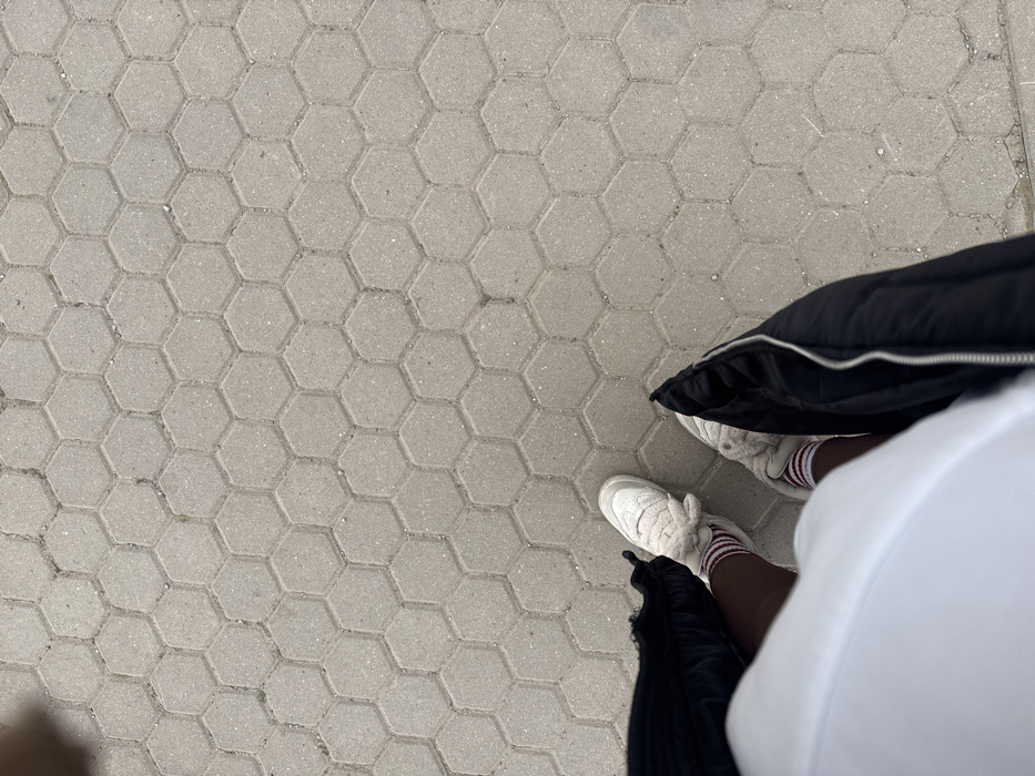 The image depicts a high-angle view of a person standing on a pedestrian walkway in Sofia, Bulgaria. The ground is paved with light grey hexagonal concrete pavers, arranged in an interlocking pattern, with fine dirt visible in the grout lines. The individual is wearing white athletic shoes with white laces and textured, light-colored trim. Striped socks, primarily red and white, are visible above the shoes, paired with dark brown or maroon leggings. A partial view of a white upper garment and a dark, likely black, puffer jacket with a visible silver zipper on the side is also observed. The person appears to be standing still.