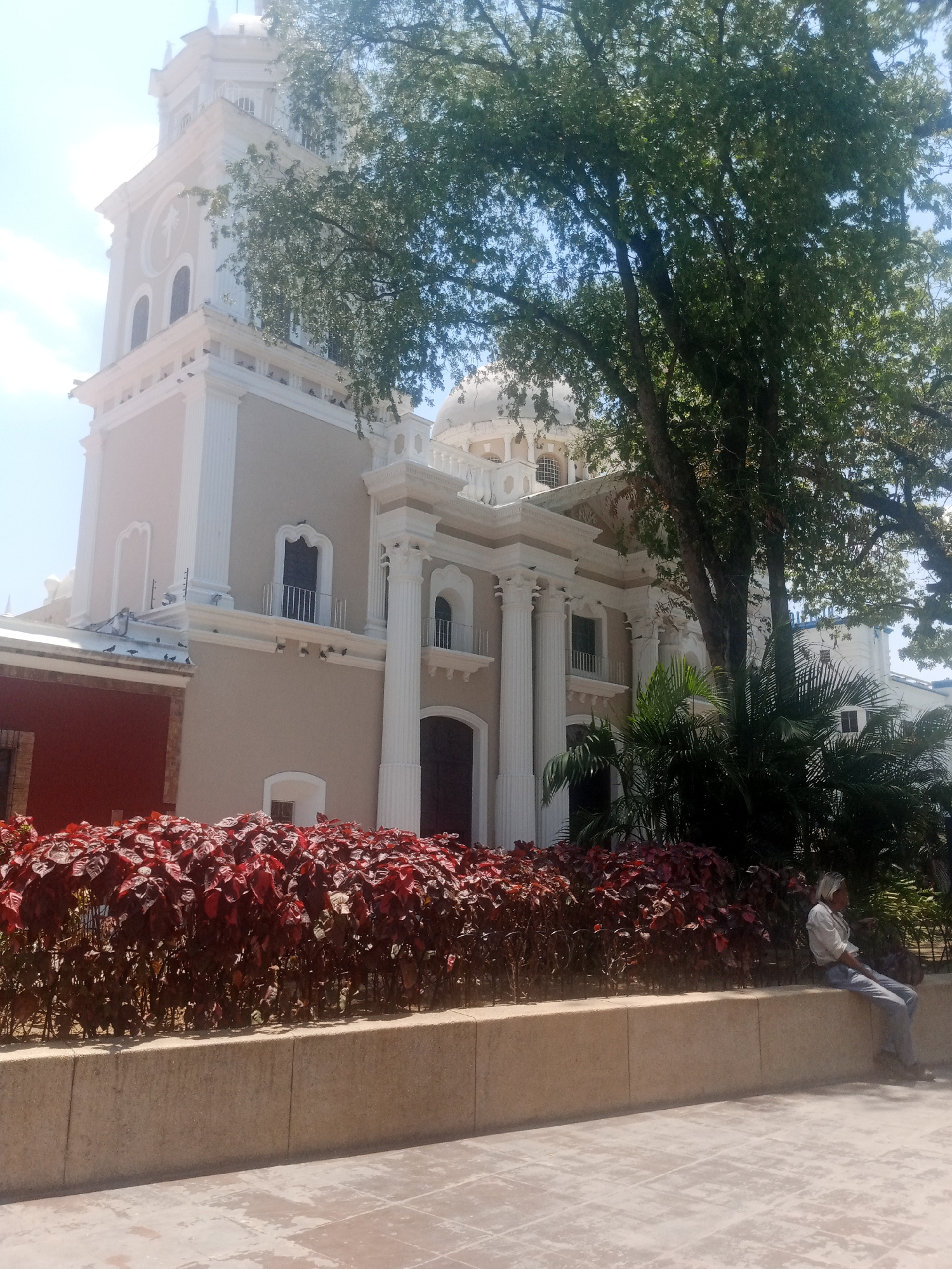 The image displays the Basílica Catedral Nuestra Señora del Socorro de Valencia, located adjacent to Plaza Bolívar in Valencia, Venezuela. The prominent structure is a multi-story ecclesiastical building with a light beige facade and extensive white architectural elements, including classical columns, balustrades, arched windows, and decorative cornices. A bell tower with a visible clock face, featuring a palm tree motif, rises on the left, while a white dome topped with a cupola is partially visible further right. In the mid-ground, a dense, manicured hedge of dark red-leafed plants, approximately 0.75 meters tall, is contained within a light-colored concrete planter. A single individual, appearing elderly with white hair, is seated on the right edge of this planter. The person is wearing a light-colored long-sleeved shirt and blue trousers, facing right with a dark bag or object positioned beside them. A large, mature deciduous tree with vibrant green foliage partially obscures the upper-right section of the cathedral, including parts of its dome. Smaller green palm-like plants are visible closer to the cathedral's main entrance area. The foreground consists of light-colored, segmented paving. The scene is illuminated by bright daylight under a clear, light blue sky. Several pigeons are discernible perched on the ledges and architectural features of the cathedral.