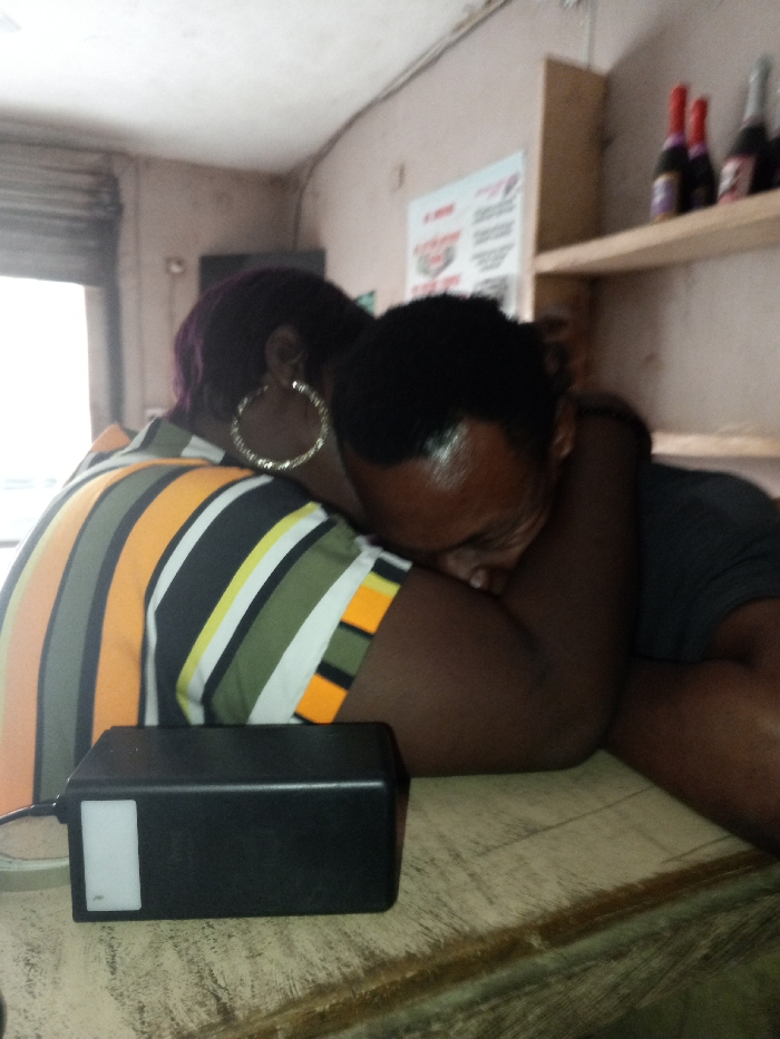 A man rests his head on a woman's arm, appearing fatigued. The woman, wearing a striped shirt with orange, white, and green hues, has a large, round earring. A black rectangular object sits on the table. A shelf with bottles is visible in the background, along with a poster on the wall. The setting appears to be a modest indoor space.