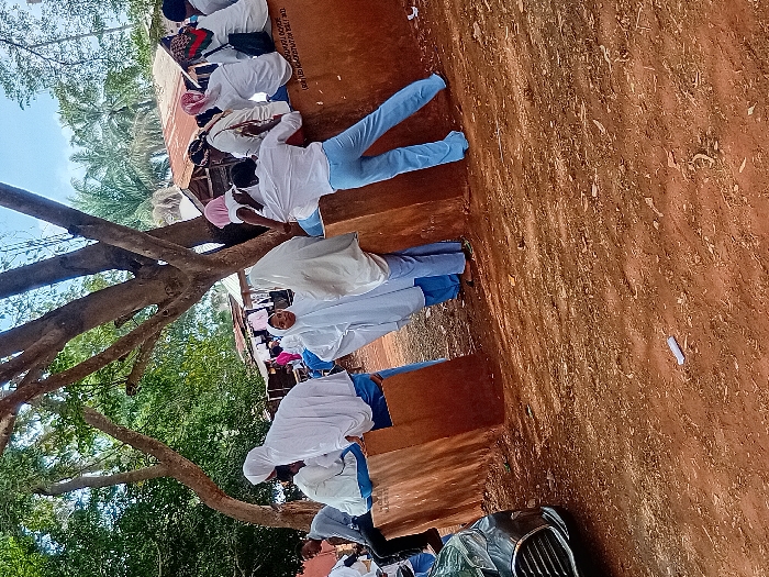 A group of students, many in white shirts and light blue pants, gather outdoors. Some wear white headscarves. They are near a building with a rusty metal roof. A large tree's branches reach into the frame. The ground is reddish-brown. The angle of the photo is tilted.