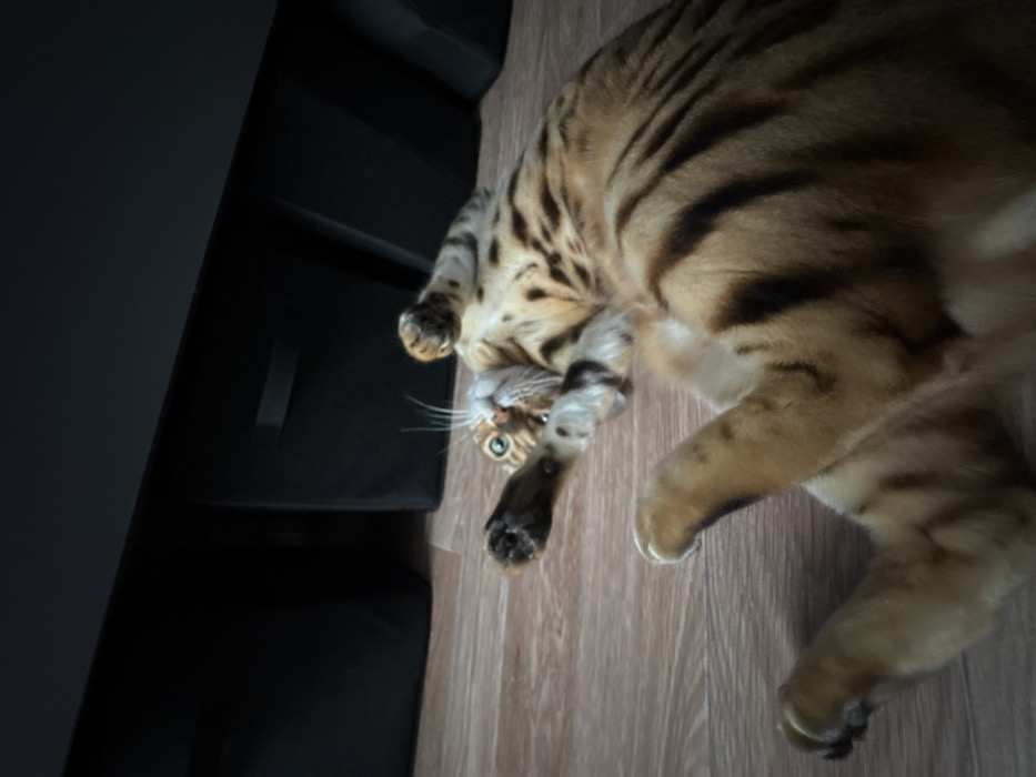- "An image taken in the city of Chusovoy, Russia, depicts a Bengal cat lying on its back on a light brown wood-grain laminate floor" by FM-qGpE52, licensed under CC BY 4.0