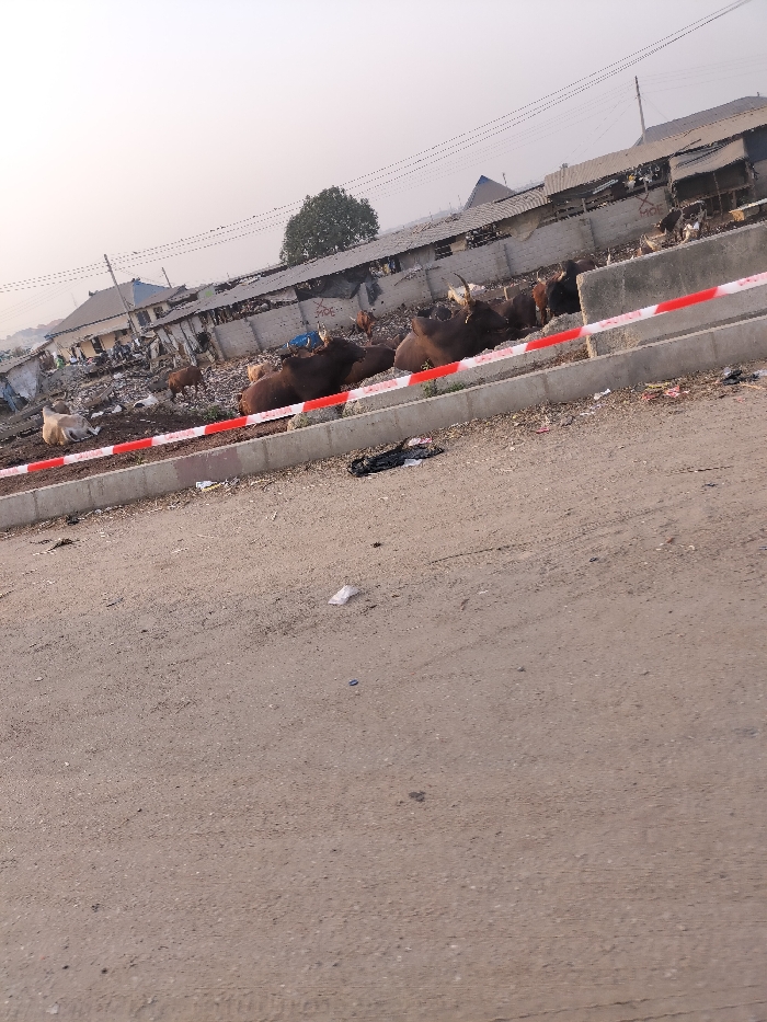 A roadside scene features a group of cows resting behind a red and white striped barrier. Some cows are lying down, while others stand or graze in a trash-filled area. Dilapidated buildings are visible in the background, with bare trees and utility lines further back. The foreground is dominated by a dusty road surface with scattered debris. The overall atmosphere suggests a run-down, possibly rural, environment.