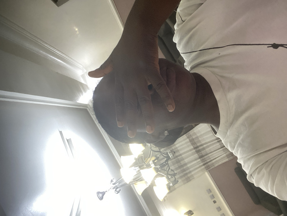 A person covers their face with their hand, obscuring their eyes and forehead. They wear a white shirt and appear to be indoors. A chandelier hangs from the ceiling behind them, with its lights creating a bright glare. The image is oriented at an angle, looking slightly upward towards the ceiling and light fixture. A window with a patterned curtain is also visible.