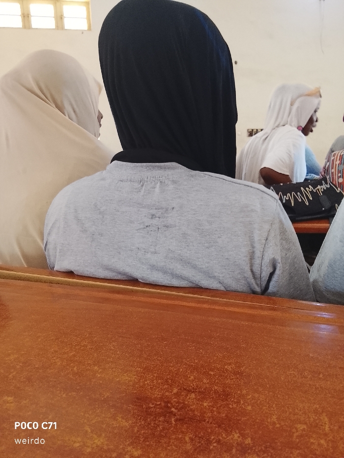 A classroom setting shows three women wearing hijabs. The woman in the center has a black hijab and a gray shirt. To her left is a woman in a light beige hijab. Another woman wears a white hijab and a white shirt is visible to the right. They are seated at wooden desks, presumably as students. A window is visible in the background. "POCO C71 weirdo" is written in the lower-left corner.