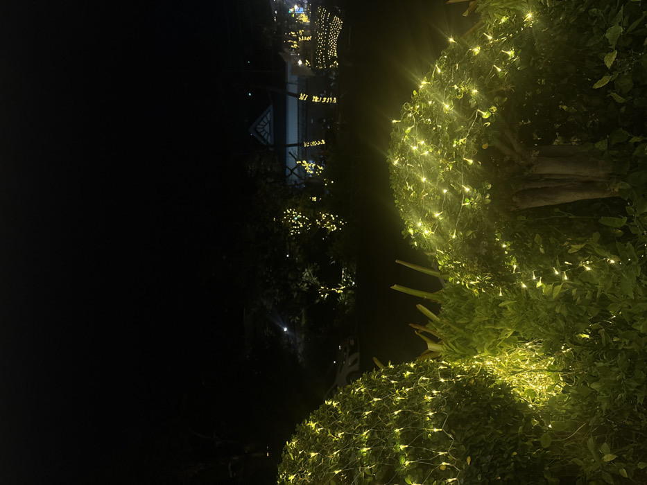 This image captures an outdoor night scene in Patong, Thailand, characterized by artificial illumination. The foreground features two prominent, dense green bushes extensively covered with numerous small, warm-toned LED string lights. The bush on the left is irregularly shaped and taller, while the bush on the right is rounded. A smaller, darker green plant with upward-pointing foliage is situated between them. The midground consists of a dark, open area, with additional trees and shrubs beyond, similarly adorned with string lights. A light-colored vehicle, possibly white, is partially visible on the left side of the midground. In the background, a building structure is visible, featuring a light-colored, possibly white, gabled roof with a dark base, suggesting local architectural influences. No individuals are present or discernible, and no specific actions or interactions are depicted.