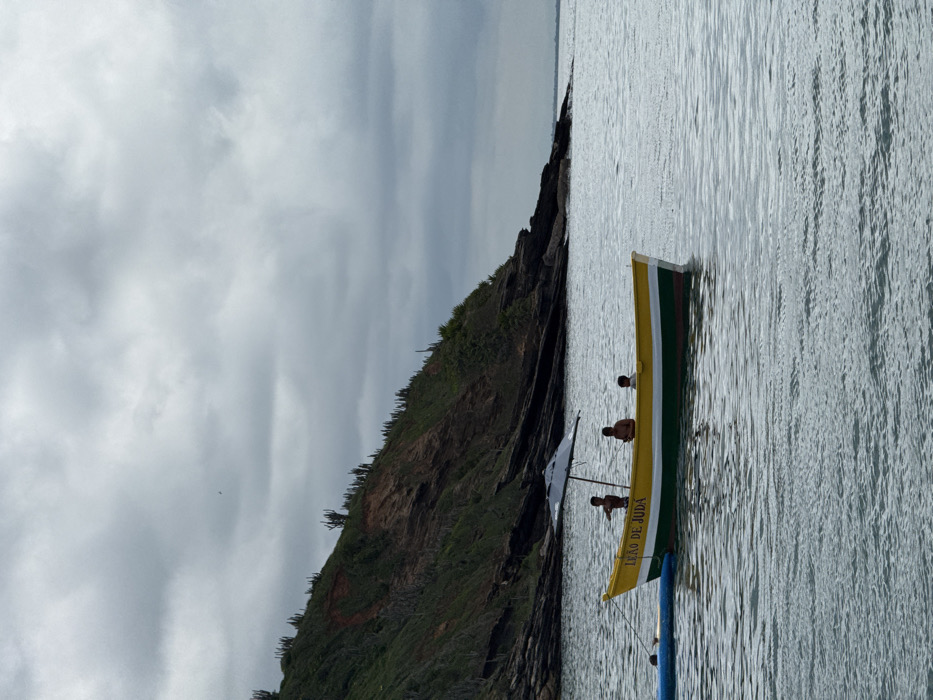A yellow, green, and white boat with the words "LEÃO DE JÚDA" painted on its side floats on the water. Three shirtless people are in the boat. The water is choppy, and the sky is overcast. Land with green vegetation and rocky formations is visible in the background.