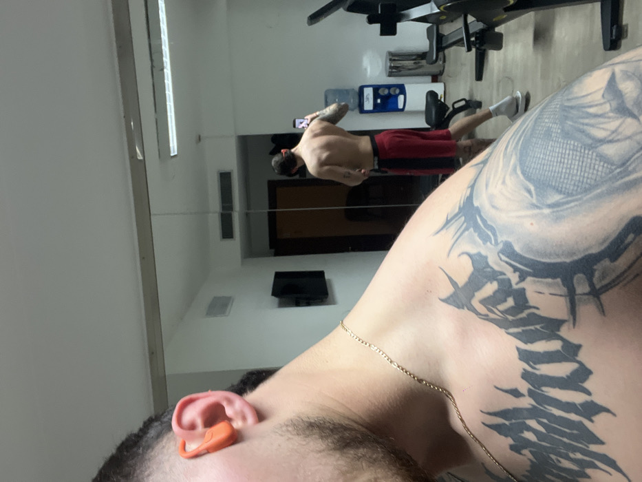 The image depicts a male subject in what appears to be a gym or fitness room in Palermo, Italy. The foreground shows a close-up of the subject's right side, including his ear, jawline, neck, and right shoulder/chest. He has short, dark hair, a beard, and an orange earbud or hearing aid in his right ear. A thin gold chain is visible around his neck. Extensive dark tattoos cover his right chest and shoulder, including gothic-style script and an intricate design on his upper arm. In the background, a large mirror reflects the same male subject, shirtless, from the rear. He is standing with a muscular physique, revealing tattoos on his back and arms. He is holding a black smartphone in his right hand, angled as if taking a photograph of his own reflection. He wears dark red shorts with a black vertical stripe, white socks, and white slides/sandals. The mirrored environment shows white walls with visible fluorescent light fixtures on the ceiling. Gym equipment, including part of a black and yellow rowing machine and an exercise bench, is visible to the right. A blue and white water cooler and a silver trash can are also present. A dark flat-screen television is mounted on the wall to the left of the reflection, and a dark doorway is visible further in the background. The flooring is a light, uniform color.