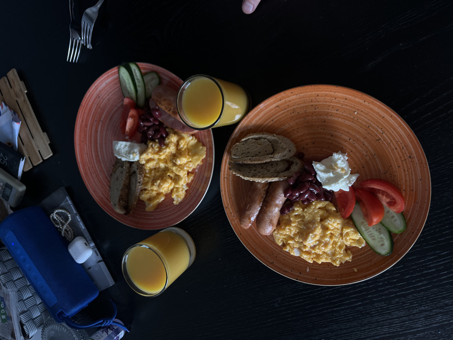The image presents a breakfast setting for two persons on a dark, possibly wooden, table in Budva, Montenegro. Two identical orange-colored ceramic plates with a textured, spiral pattern are featured. The plate in the foreground contains scrambled eggs, three cooked sausages, red kidney beans, two slices of dark, seeded bread, a dollop of white creamy substance, and slices of red tomato and green cucumber. Adjacent to this plate is a tall glass filled with orange juice. A human thumb is partially visible on the right edge of the image, near this plate. The second plate, positioned further back, also contains scrambled eggs, red kidney beans, two slices of dark, seeded bread, a dollop of white creamy substance, and slices of red tomato and green cucumber, with one cooked sausage partially visible. A second tall glass of orange juice accompanies this plate. Two silver forks are visible to the right of the background plate. The upper left portion of the table displays personal items including a blue portable speaker, a white AirPods charging case, a strand of pearls, and a dark-covered book. The upper right portion shows multiple remote controls, a small wooden coaster, and a partially visible mobile phone screen displaying '23:3'.