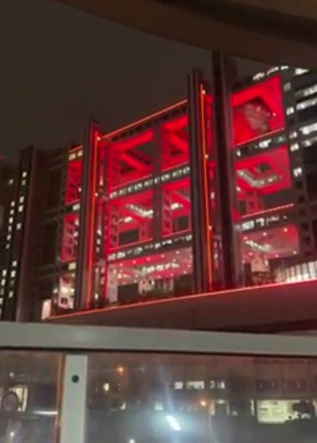 At night, a building stands prominently in the foreground, illuminated with red lights outlining its steel structure