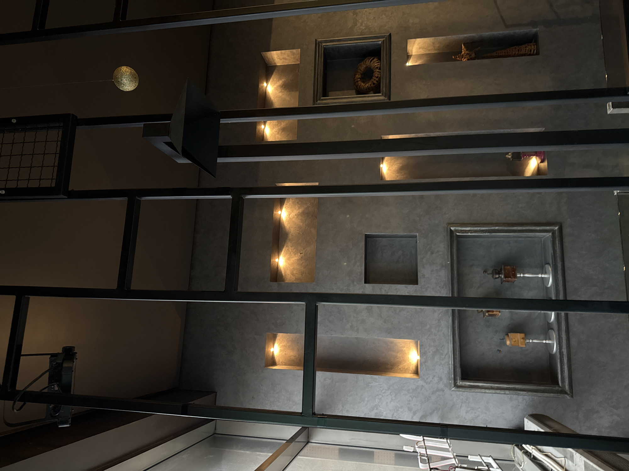 The scene depicts an interior space located in Shumen, Bulgaria. The dominant feature is a dark grey, textured wall incorporating multiple recessed niches of various rectangular and square dimensions. Several niches are illuminated by warm-toned accent lights. A large, framed rectangular niche positioned at the lower-left contains two miniature, antique-style objects, possibly grinders, mounted on silver pedestals. An adjacent, smaller niche below it holds a small, brightly colored (likely purple) object. A framed square niche on the upper-right displays a circular, woven, light-brown decorative object. A tall, vertical niche on the far right side contains a dark, textured, sculpted item. In the foreground, a prominent dark metal architectural partition composed of vertical and horizontal bars partially frames the view. The ceiling is dark. Suspended from the ceiling are a black, inverted pyramid-shaped light fixture and a spherical, golden, textured decorative lamp. A projector is mounted on the ceiling in the upper-left quadrant. A large window on the far left reveals an exterior or brightly lit adjacent area, with vertical blind elements partially visible. No individuals or animals are present in the image.