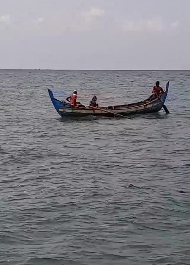 small, narrow wooden boat with three people in it, on a body of water. The boat is light brown on the inside and has a blue trim on the outside. The people in the boat appear to be rowing it, though one person is just sitting on the front, holding a long pole. The water is dark and choppy. In the distance, there is a faint outline of what appears to be land and ships. The sky is overcast.
