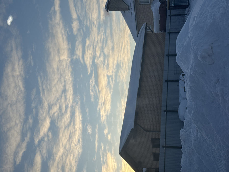 A winter scene with a blue sky filled with wispy white clouds. A building with a snow-covered roof stands beside a fence. A large mound of snow leans against the fence, dwarfing its height. The building's brick facade is visible, contrasting with the white snow. The sun casts a soft, warm glow.