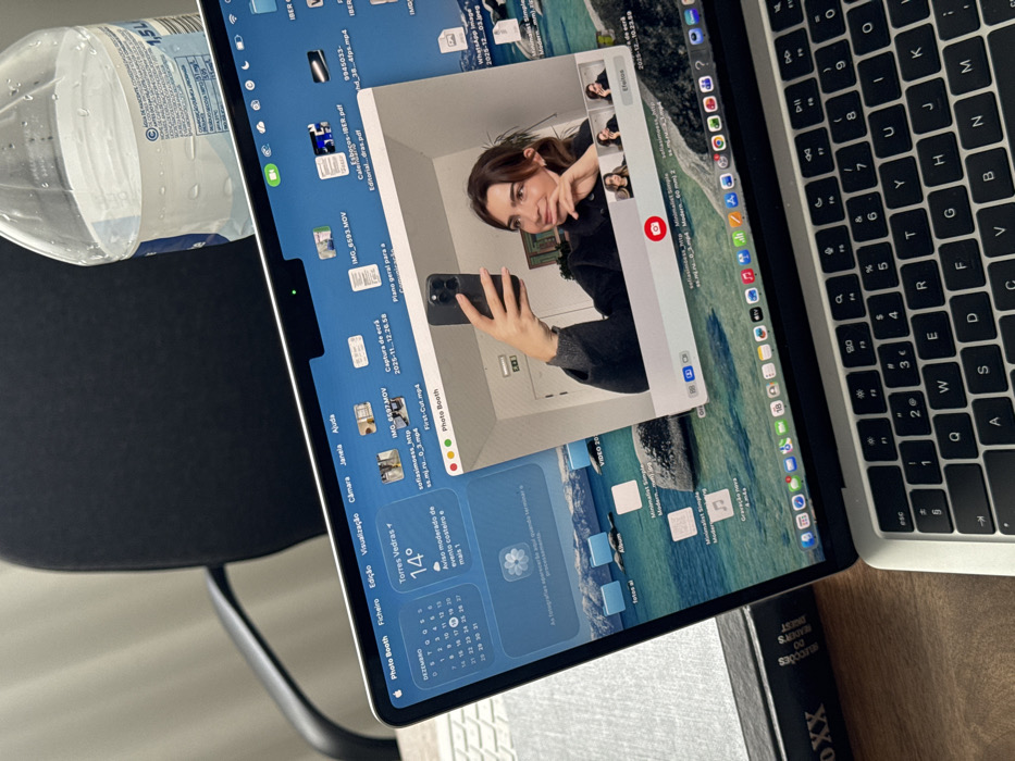 An overhead view captures an indoor scene featuring an open silver Apple MacBook laptop resting on a dark wooden desk. The laptop screen displays the macOS desktop with a blue-hued scenic wallpaper depicting water and smooth stones. On the left side of the screen, a weather widget indicates "Torres Vedras," "14°," and "Aviso moderado de evento costeiro e mais 1" (Moderate warning for coastal event and 1 more), confirming the location as Torres Vedras, Portugal. A calendar widget for December is also visible, with the 14th highlighted. A "Photo Booth" application window is open prominently on the screen, displaying a live webcam feed. Within this feed, a young Caucasian female with medium brown hair is shown from the chest up, holding a dark-colored smartphone in her right hand to take a selfie. Her left hand is near her chin, and she is smiling faintly, looking towards the phone. The reflection in the Photo Booth window shows a light-colored room with what appears to be an emergency exit sign. Three small thumbnail images of the same woman are visible at the bottom right of the Photo Booth window. The laptop's menu bar and various file icons (videos, PDFs, images) are also visible across the desktop. To the left of the laptop, a thick, dark-bound book with white text on its spine, reading "DO XX" and partially "Juntos Saber," rests on the desk. Behind the laptop on the right, a clear plastic 1.5-liter water bottle with condensation droplets and a white label (indicating "ÁGUA DE NASCENTE") stands upright. In the blurred background, a black office chair with an armrest is partially visible against a light-colored wall. The laptop's keyboard, featuring a QWERTY layout with Portuguese characters, is in the foreground.