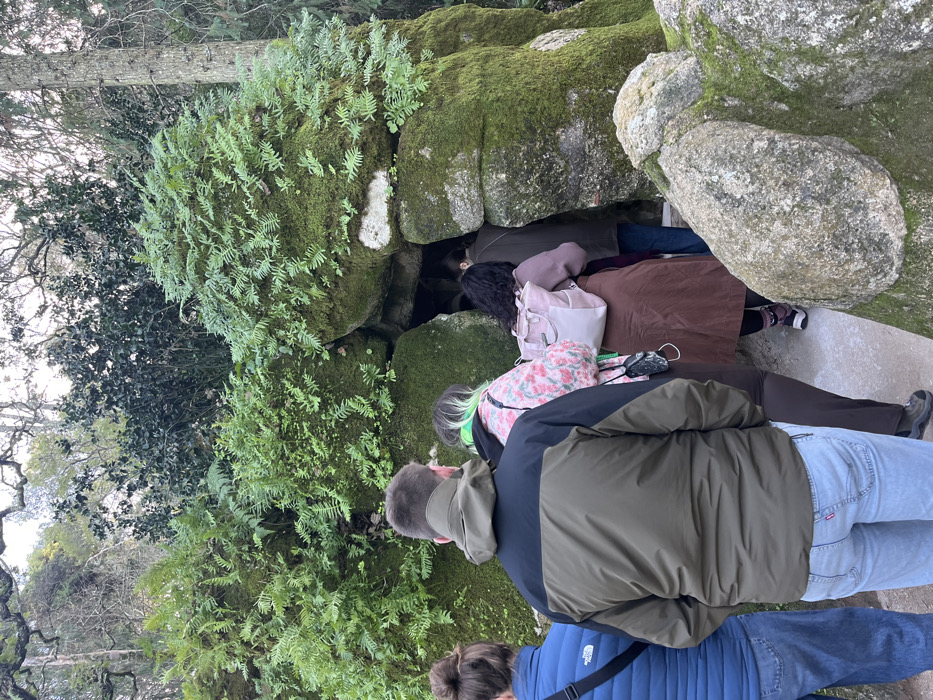 The image captures a group of six individuals queuing to enter a moss-covered grotto at the Quinta da Regaleira estate, located in Sintra, Portugal