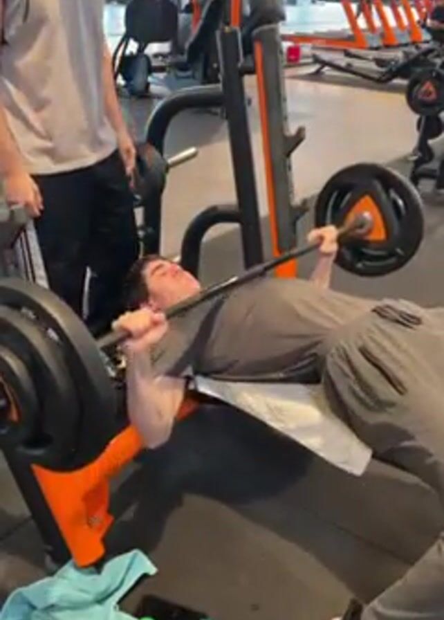 In a gym, a man lies on a weight bench performing a bench press exercise with a loaded barbell