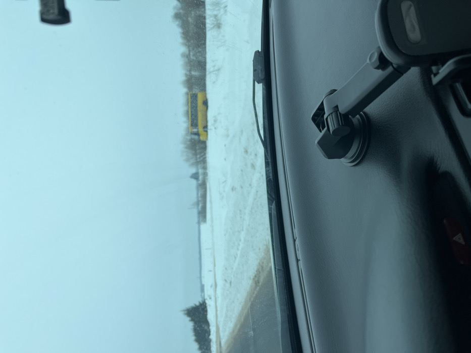 The scene depicts a winter landscape in Карабоўскі сельскі Савет, Belarus, viewed from inside a vehicle. The foreground shows a dark grey or black dashboard occupying the lower portion of the image. A black phone mount with a suction cup base is affixed to the dashboard on the right side, extending its arm towards the right. A red triangular hazard light button is visible on the lower left of the dashboard. A windshield wiper blade rests at the base of the windshield. Beyond the windshield, a snow-covered environment is visible under an overcast, light grey sky. A two-lane asphalt road, partially covered with slush or dirt, runs along the left side of the frame, receding into the distance. The ground adjacent to the road and extending across the midground is covered in snow. A yellow bus is parked or stationary in the snow-covered field on the right side of the road, oriented with its side visible. Sparse, bare vegetation, including bushes and small trees, is scattered across the snowy field behind the bus. A dense cluster of dark green coniferous trees stands on the far left horizon. The overall impression is a cold, cloudy winter day. No individuals are visible.