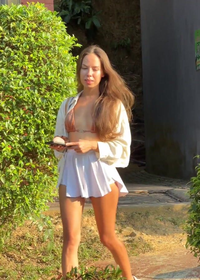 woman standing in a grassy, outdoor environment. She's holding a cell phone in her hands and appears to be looking at it. She has long brown hair, and her attire consists of a brown bikini top, a white unbuttoned shirt, a white skirt, and white sneakers. There are green bushes on either side of her, and a building can be seen in the background.
