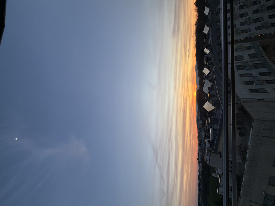 vertical view of a sunset sky transitioning from dark blue to orange. Wispy clouds streak horizontally across the gradient. A crescent moon is visible in the upper left. On the right edge, a cityscape is visible, including buildings, structures with square panels, and what appears to be dense foliage below. The buildings are constructed of concrete. The image is slightly rotated.