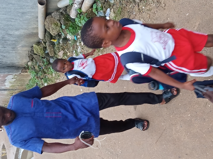 The image depicts three individuals walking on an unpaved dirt path in Aba, Nigeria. An adult male, positioned on the left, wears a blue short-sleeved tunic with red detailing, black trousers, and black open-toed sandals. He holds a black portable electronic device with a white cord in his right hand and grasps the left hand of a smaller child with his left hand. His gaze is directed downwards. To the adult's immediate right, a young child wears a white short-sleeved top with a red logo, a red skirt, and a blue backpack. This child's left hand is held by the adult male, and their expression is neutral as they look towards the viewer. Further in the foreground and to the right, a second, slightly older child walks ahead. This child wears a white short-sleeved top with a red logo, red shorts with white side stripes, and a blue backpack with an attached blue water bottle. A dark-colored bag is carried in their right hand. This child's face is blurred due to motion. The ground is a light brown dirt path. The background features a weathered concrete or plastered wall. Along the base of this wall, an accumulation of rocks, scattered green vegetation, and various debris, including several light-colored pipe sections and plastic refuse, is visible.