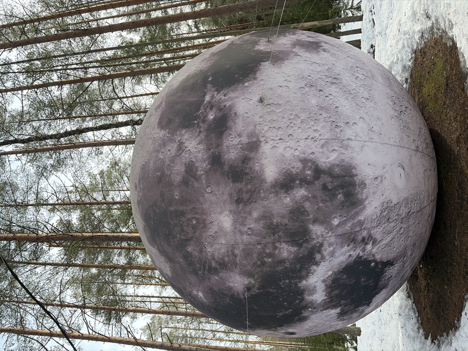 - "A large, spherical inflatable object, replicating the Moon's surface with detailed gray and dark gray features including craters and maria, is situated in a pine forest in Kerro, Russia" by FM-dJ01l1, licensed under CC BY 4.0