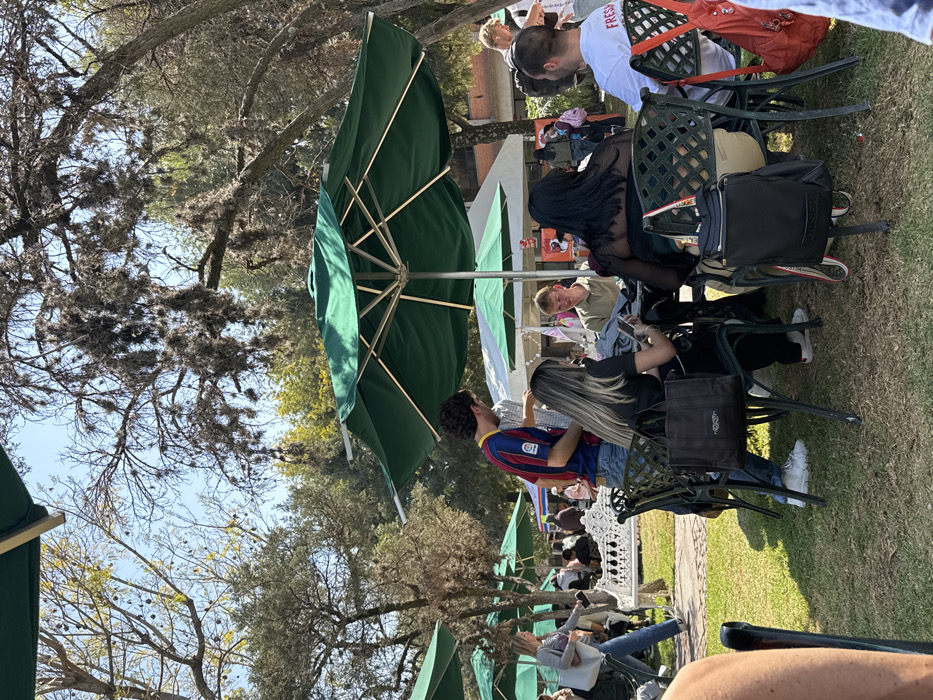 People sit at tables under green umbrellas on a sunny day. Some are wearing casual clothing, with one person sporting a Barcelona jersey. Outdoor furniture occupies a grassy area lined with trees, providing a shaded seating arrangement. The atmosphere is relaxed, likely an outdoor dining or gathering space.