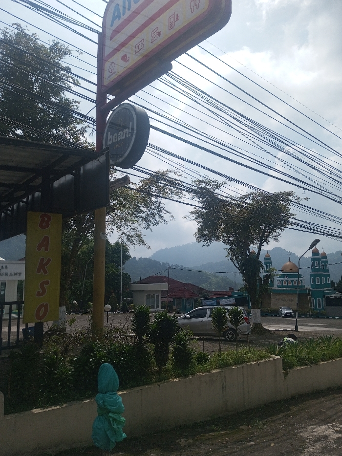 The image displays a daytime outdoor scene in Niz Lakuk, India, featuring commercial and religious structures against a mountainous backdrop under a cloudy sky. In the foreground, a low concrete wall fronts an area of green shrubs and small trees. A teal-colored, bundled object or wrapped plant stands upright on the ground near the left edge. The midground features a prominent vertical pole supporting multiple signs on the left. A partially visible rectangular sign at the top bears "Al" in red and white, indicative of "Alfamart", along with service pictograms. Below this is a circular black sign with "bean! SPOT" in white text. A vertical yellow banner displaying "BAKSO" in black hangs from an adjacent structure. To the right, a silver minivan is parked on a paved surface. Behind it, a single-story white building with a brown roof is visible. Further right, a distinct teal-colored mosque with two prominent golden-domed minarets and two smaller green domes stands. A second smaller silver car is parked near the mosque entrance. One individual is visible on the far right, bent over and performing an unspecified ground-level activity. No other people are clearly identifiable. The background is dominated by a range of green, tree-covered mountains. Numerous black utility wires crisscross the upper portion of the image against the cloudy sky.