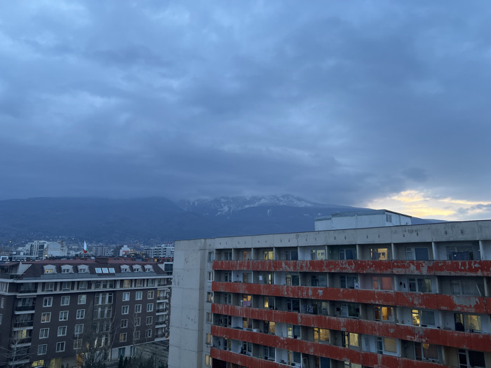 An elevated view captures a sprawling urban landscape in Sofia, Bulgaria, set against the backdrop of Vitosha Mountain, whose upper slopes are partially snow-capped. The sky is largely overcast with blue-gray clouds, exhibiting a faint yellow-orange hue on the far right horizon, indicative of twilight. In the immediate midground, a large, multi-story building with a weathered facade dominates the right side of the frame. Its exterior, primarily concrete, shows significant peeling of what appears to be orange-red paint, revealing lighter patches underneath. This building features numerous rectangular windows and balconies across its visible six floors; several windows on different levels are illuminated from within. The uppermost section of this structure presents a distinct architectural style with a lighter, perhaps newer, finish. To the left and slightly further back, another multi-story residential building, appearing to be in better condition, displays a brown or dark beige facade with a symmetrical arrangement of windows and balconies. A Bulgarian flag (white, green, red horizontal stripes) is discernible atop the roof of a building in this cluster. The city extends into the distance, with various buildings and structures filling the area between the immediate foreground and the base of Vitosha Mountain. No individuals or explicit actions are discernible within the frame. The overall environment is urban and mountainous, under a cool, muted light.