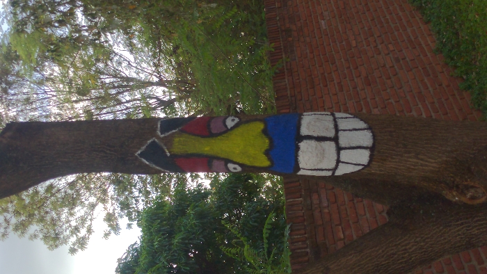 A tree trunk, oriented horizontally, features painted art. On the left, a black and yellow design surrounds an eye. The trunk transitions into shades of red and yellow, also encompassing another visible eye. Blue paint follows, ending with a pattern of large white squares outlined in black. Beyond the painted section, the natural wood bark is visible. Lush green trees and foliage surround the tree trunk, with a brick wall appearing in the background.