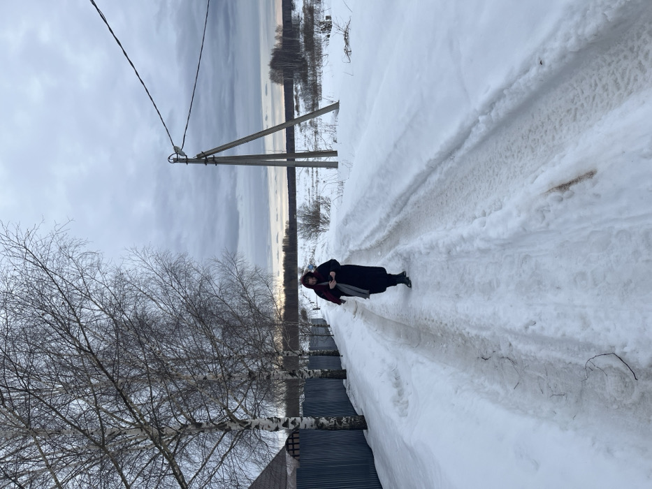 A solitary individual walks on a snow-covered rural road in Kalinino, Russia, under an overcast sky