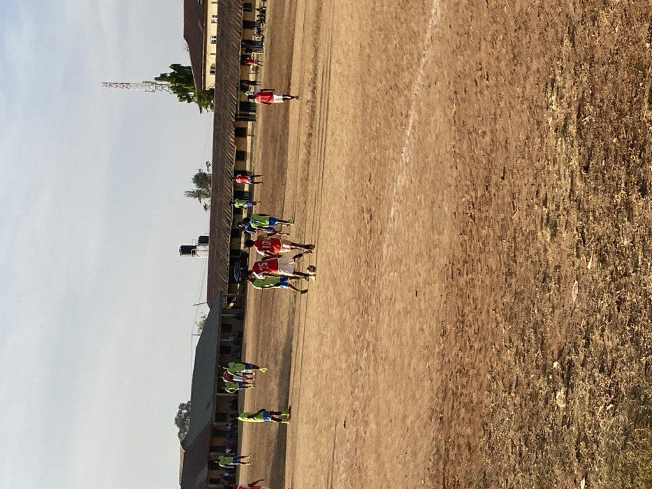 A soccer game appears to be in progress on a dirt field. Several players wearing red and green jerseys are visible, with one near the center having possession of the ball. A long building with a covered walkway runs along one side of the field. A tall communication tower stands in the background against a clear, bright sky. The field is dry, with noticeable patches of sparse vegetation.