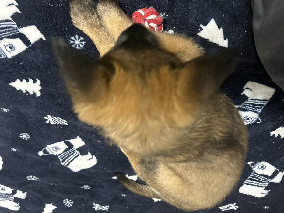- "The image, taken in Hrabarsko, Bulgaria, displays a tan and dark-furred puppy lying on a navy blue blanket" by FM-sT5Bj1, licensed under CC BY 4.0