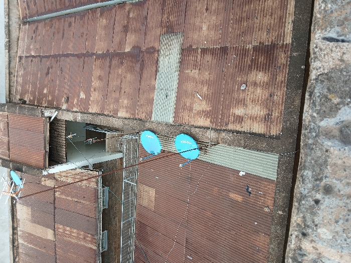 An aerial view depicts weathered, corrugated metal rooftops of aged buildings. Some sections have lighter, possibly newer metal sheets. Two blue satellite dishes are prominently positioned. An open interior space can be seen beneath one roof overhang. A thin, metallic structure, possibly a ladder, extends up the side of a building. The edge of a weathered, concrete structure appears in the right of the frame. Utility wires crisscross the scene.