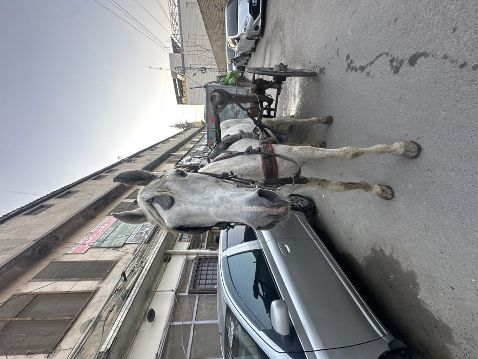 A light gray horse with a harness stands hitched to a cart on an urban street. A silver sedan partially obscures the horse's body. Multi-story buildings line the street with weathered facades and various signs. Other vehicles are parked further down the street. The sky is hazy.