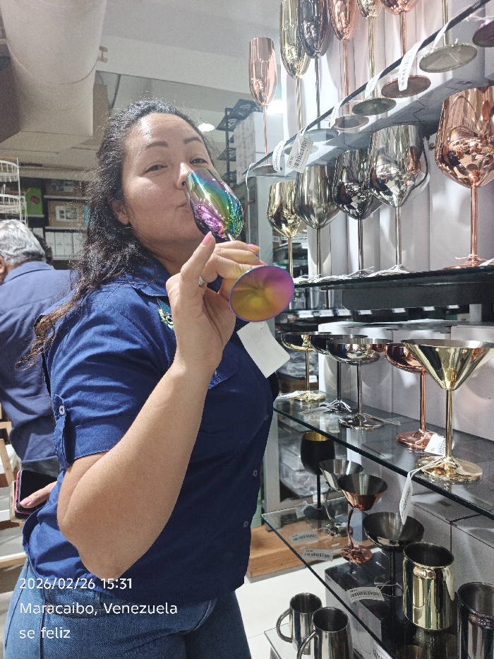 The image captures an indoor scene within a retail establishment located in Maracaibo, Venezuela, dated 2026/02/26 at 15:31. In the foreground, a woman with dark, wavy hair, dressed in a dark blue short-sleeved collared shirt and blue jeans, holds an iridescent, multi-colored metallic stemmed champagne flute to her mouth, adopting a puckered lip expression. A silver-toned ring with a central stone is visible on her left ring finger. Positioned in the background to the left, the back of a man's head and shoulder, exhibiting gray hair and wearing a blue shirt, is partially visible. The midground and background feature a retail display system comprising multiple glass shelves. These shelves are stocked with various metallic drinkware, including champagne flutes, wine glasses, martini-style glasses, coupe glasses, and mugs, presented in rose gold, gold, and silver finishes. Small white labels are affixed to several of the displayed items. The lighting appears to be artificial, consistent with an indoor commercial setting.