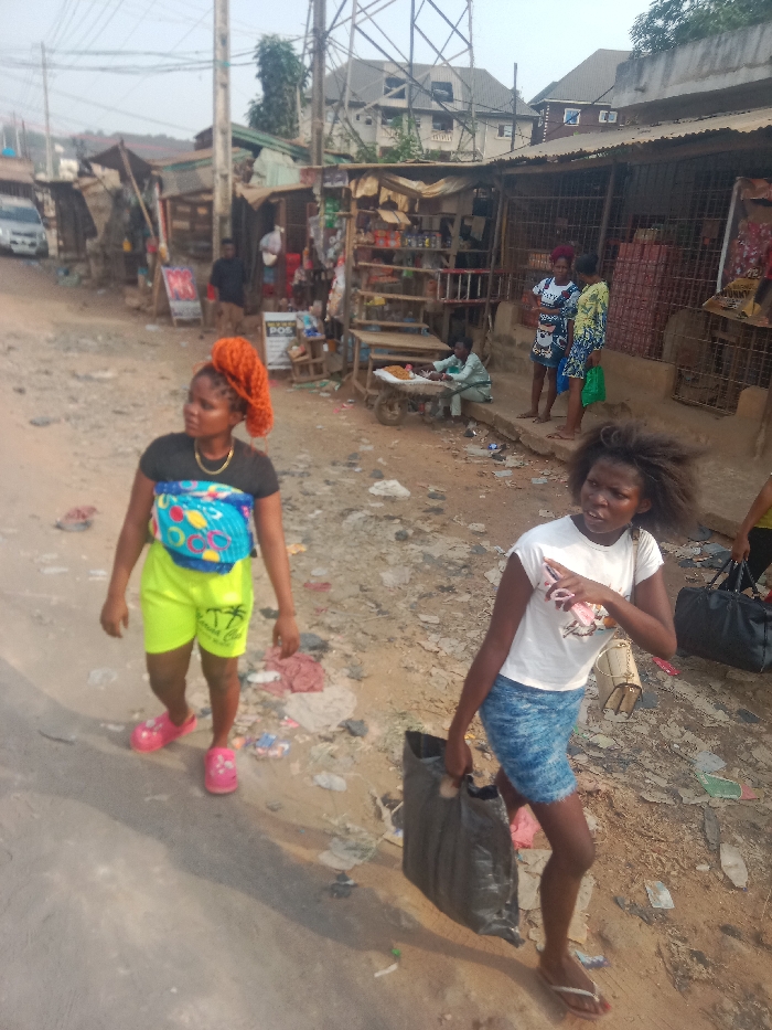 The image depicts an active, unpaved street in Onitsha, Nigeria. The ground is composed of dirt and extensively littered with various debris. On the right, a series of rudimentary market stalls with corrugated metal roofs and wooden supports line the street, displaying goods. In the foreground, two women walk right-to-left across the frame. The woman on the left, facing right, wears a black short-sleeved top, neon yellow shorts with a white graphic, pink clogs, a blue multi-patterned fanny pack worn across her chest, and a prominent, voluminous orange headwrap. The woman on the right, facing left, wears a white short-sleeved t-shirt, a blue and white patterned mini-skirt, light-colored flip-flops, carries a black plastic bag in her left hand, and a light-colored shoulder bag, with her right hand raised in a gesturing motion. Her dark hair is voluminous. In the midground, several individuals are present around the market stalls. Two women stand near a stall: one in a patterned dress with red-tinted hair and her hands on her hips, and another in a yellow-green patterned dress holding a green plastic bag. A man in a light green long-sleeved shirt sits on a low stool beside a wooden cart laden with items. Another man in a dark shirt is partially visible further left among the stalls. A large metal electrical transmission tower dominates the background, with multi-story buildings visible behind the market structures. A white vehicle is partially visible on the far left. The scene is illuminated by daylight.
