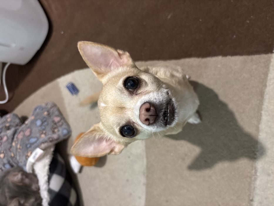This image depicts an indoor scene in Nesebar, Bulgaria. The primary subject is a fawn-colored Chihuahua dog positioned centrally in the foreground, facing the viewer. The dog has erect ears, dark, prominent eyes, and its mouth is slightly open, exposing a few lower teeth. A dark shadow, cast by the dog, extends onto the carpet directly in front of it. In the upper left background, a gray cat is partially visible, resting or sleeping in a black and white checkered pet bed with a white, plush rim. Adjacent to the pet bed, a gray fleece blanket with multicolored paw print patterns is visible. On the beige and brown patterned carpet, an orange spherical toy and a small blue spring-shaped object are present. A portion of a white appliance is visible in the upper right background. The environment is carpeted and appears to be illuminated by an overhead light source.
