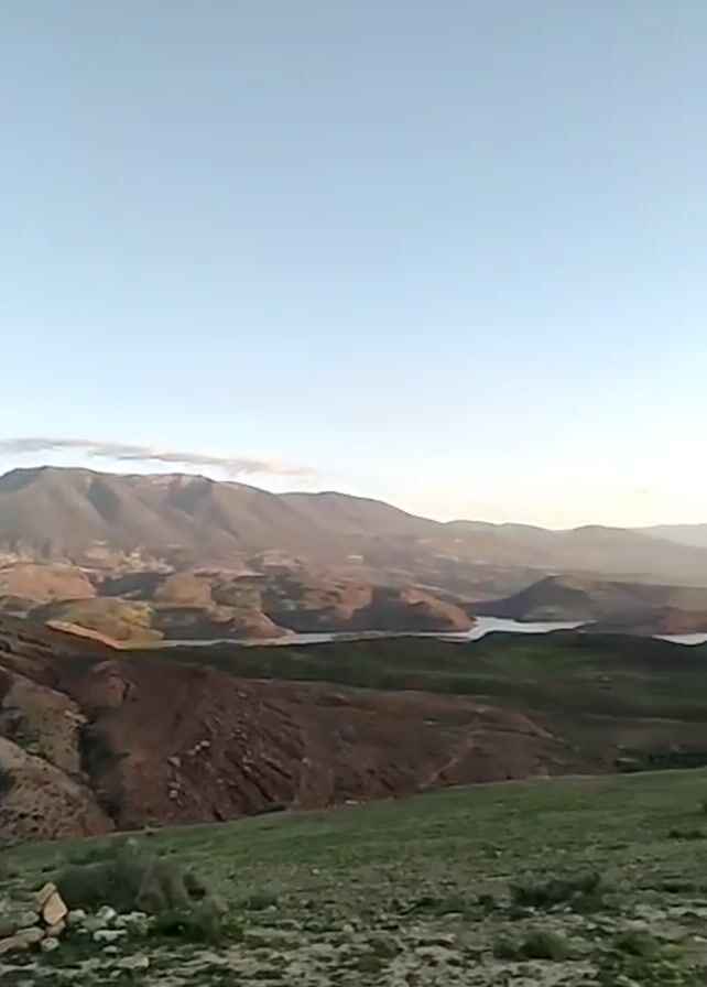 view of a lake surrounded by hills and mountains under a clear sky. The foreground features a grassy hill with some bushes. The lake stretches into the distance, its calm surface reflecting the sky. Mountains rise in the background, some shrouded in a soft haze. The lighting suggests it's either early morning or late afternoon. There's a child audible, exclaiming "wahh."